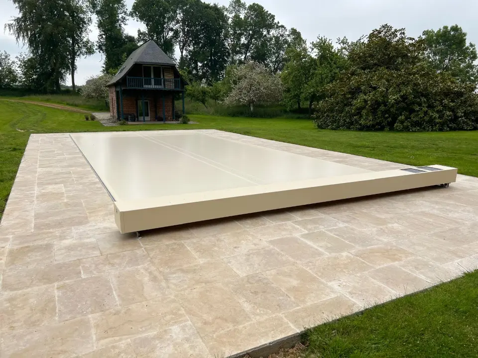 Piscine exterieur avec terrasse mobile en 2 panneaux coulissants