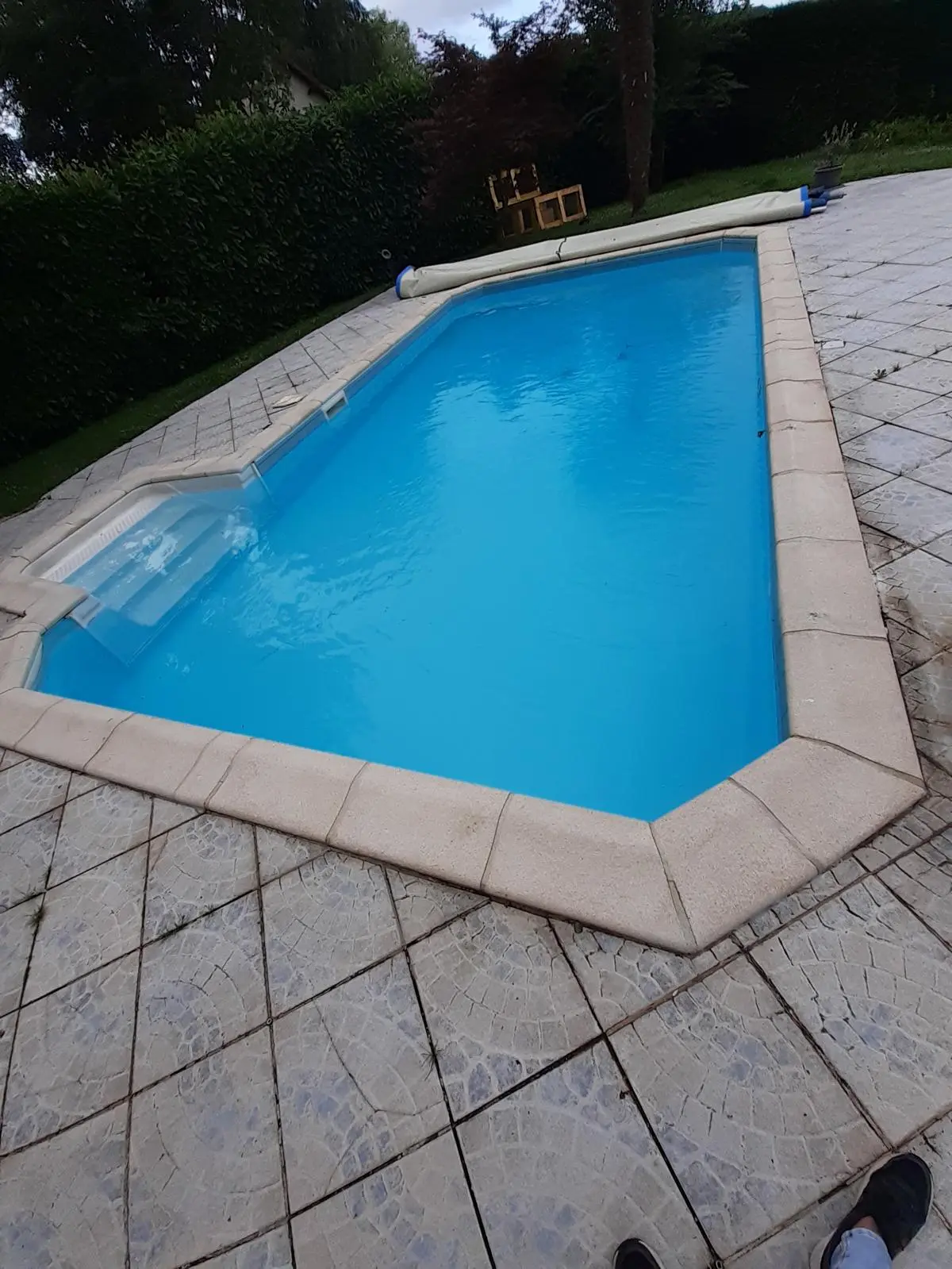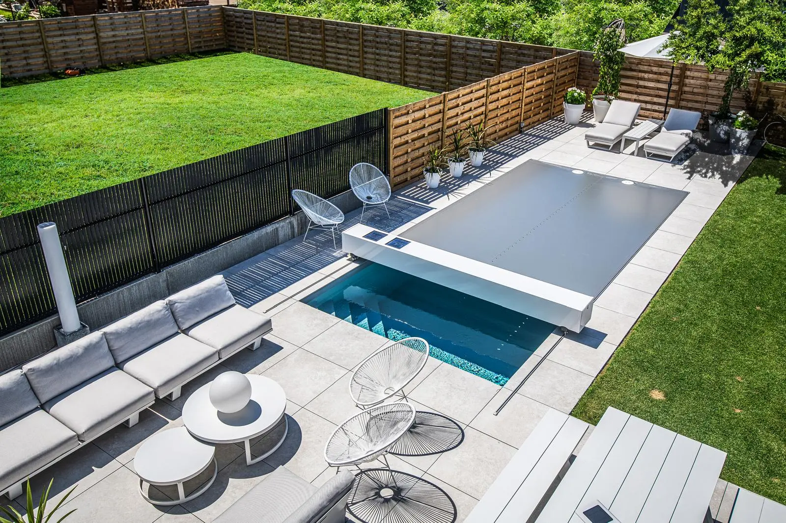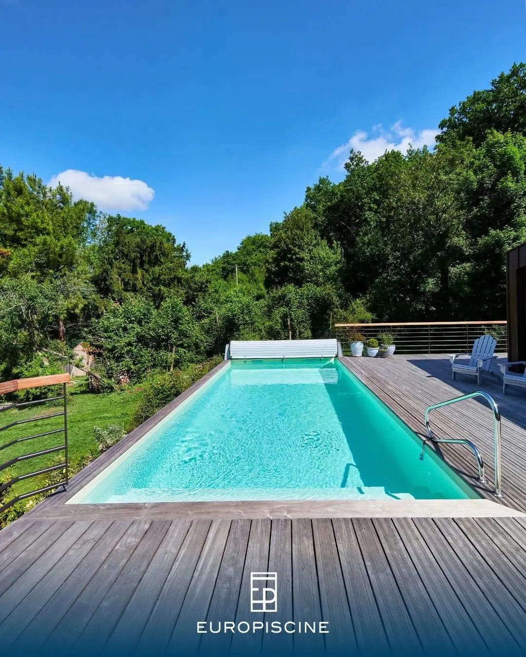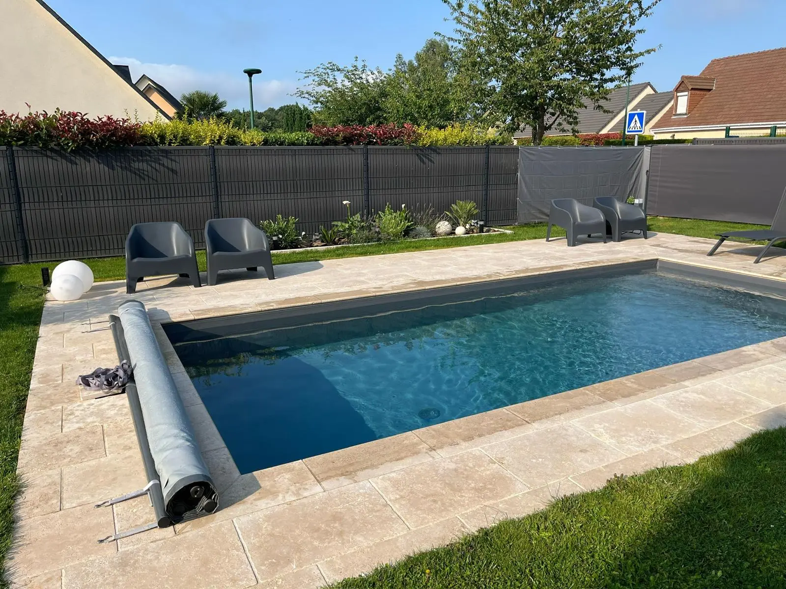 L’escalier Roman a été retiré pour faire place à une plage immergée. Le liner a été remplacé par une membrane armée gris anthracite. Enfin, le volet immergé a été remplacé par une couverture de sécurité @Coverseal (3), optimisant ainsi l’espace dans le bassin. ✨