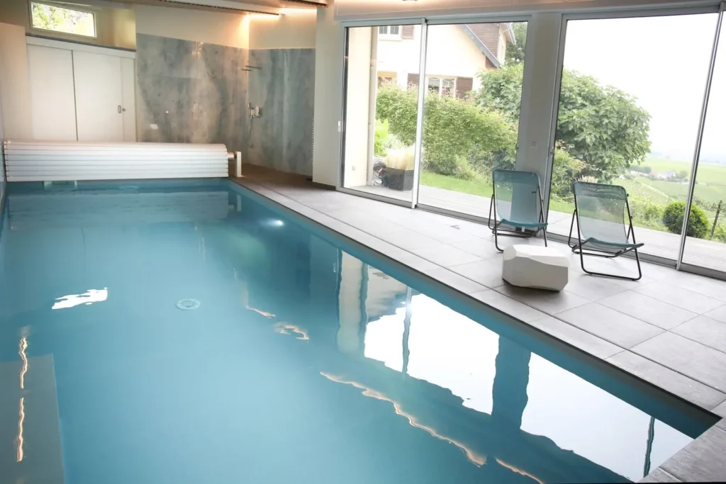 Découvrez cette magnifique piscine in intérieure qui donne sur un petit salon et un extérieur.